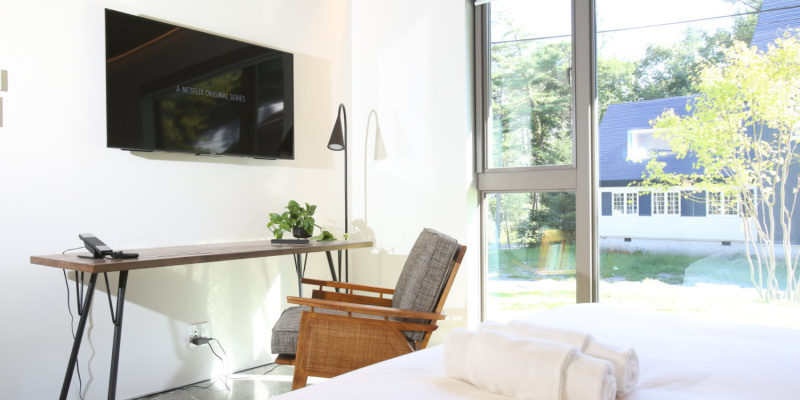 - Large flat-screen 4K TV with Apple TV and Netflix; Bose SoundDock
