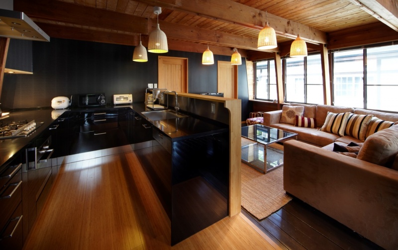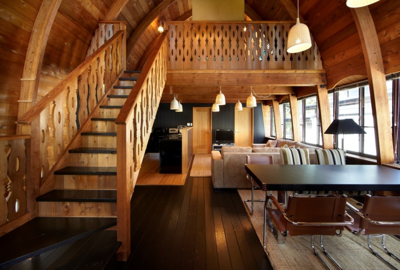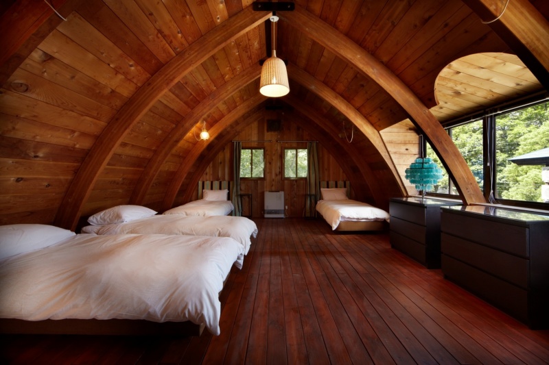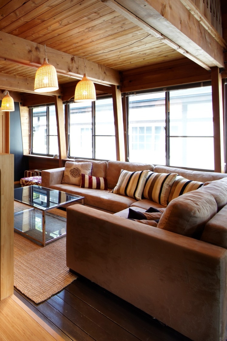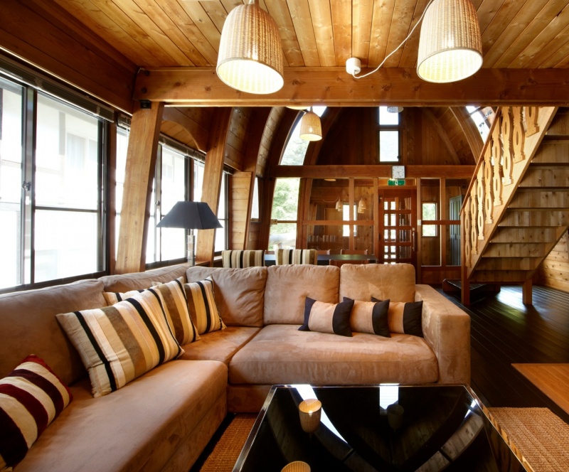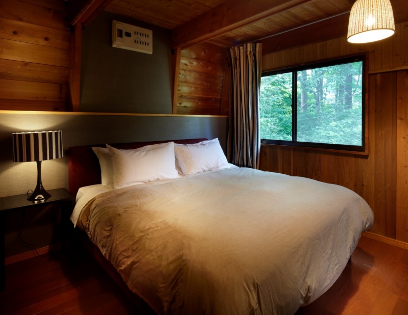Natural forest views invite the outdoors in, enhancing the home’s charming mountain chalet feel. This rustic-style house is cool and contemporary inside, with minimalist interiors that focus on simplicity for a relaxing atmosphere. The master bedroom with adjoining bathroom also has an upstairs mezzanine which sleeps up to 4 extra family or friends.