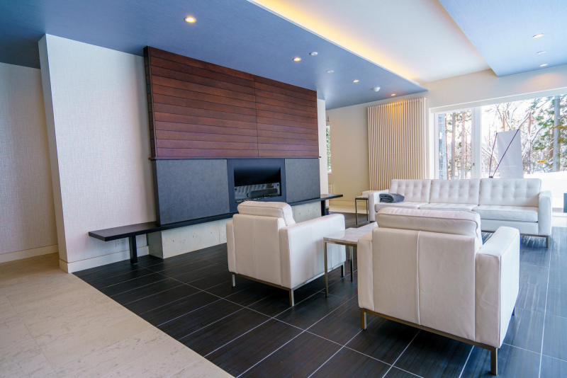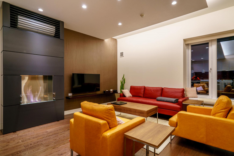 - Modern gas fireplace with stone hearth